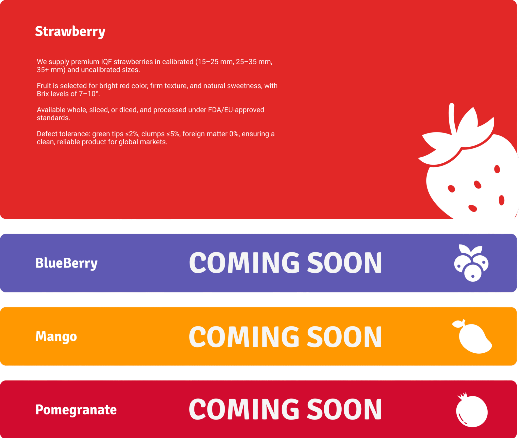 Export of IQF frozen strawberries and other fruits, sourced from our own farms and trusted partner farms.