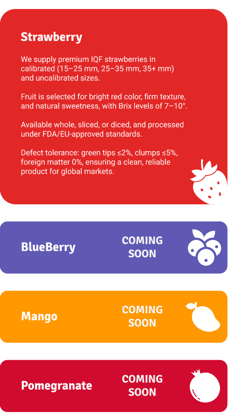 Expertise in producing and exporting IQF strawberries with excellent flavor, color, and uniformity.